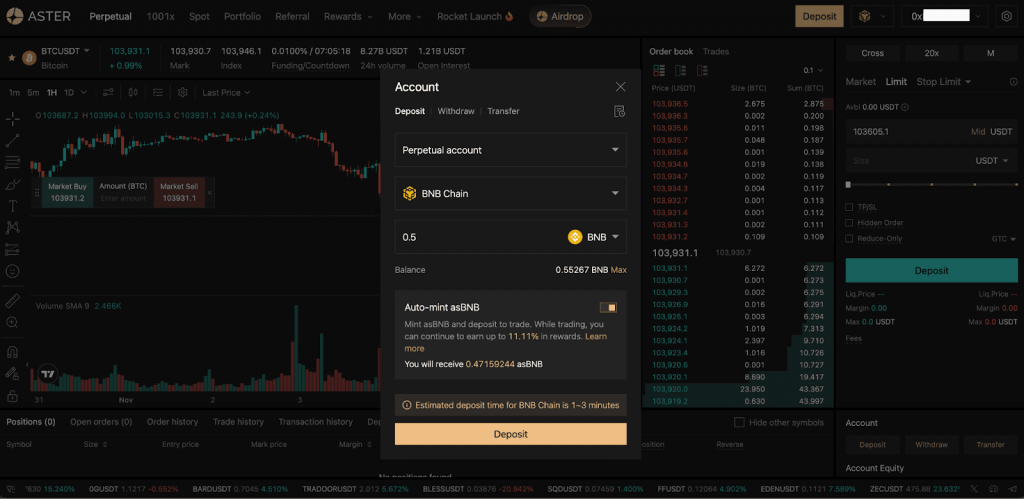Aster 另一個吸引人的功能,就是用戶可以使用保證金賺取額外的收益,而且還不少!一般傳統永續合約中,保證金就是開倉的抵押品,但在 Aster 入金時會自動換算可以拿到多少 asBNB(能自動賺取 BNB 質押收益)或 USDF(Aster 的穩定幣)作為保證金,而這些保證金就在支持合約倉位的同時,還能產生被動收益,下圖就顯示了截圖時有高達 11.11% 的額外收益!