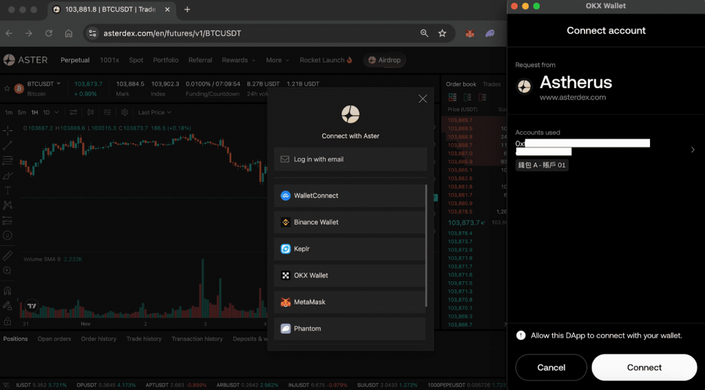 2. 點右上方 Connect Wallet,選擇你用的錢包,點擊 Connect 跟 Aster 連線。