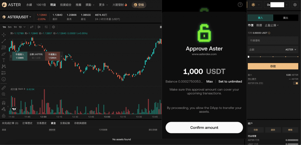 *如果選擇 set to unlimited 代表 Aster 可以動用你錢包中所有的 USDT,會存在不小的風險,不建議使用。