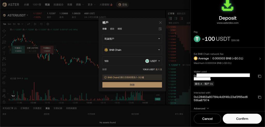 2. 等錢包的 USDT 完成授權給 Aster 使用後,將要使用的金額存到 Aster 平台上,花費時間大約 1~3 分鐘,完成後可以在右下方的 Spot overview 或正下方的資金查看 USDT Available。