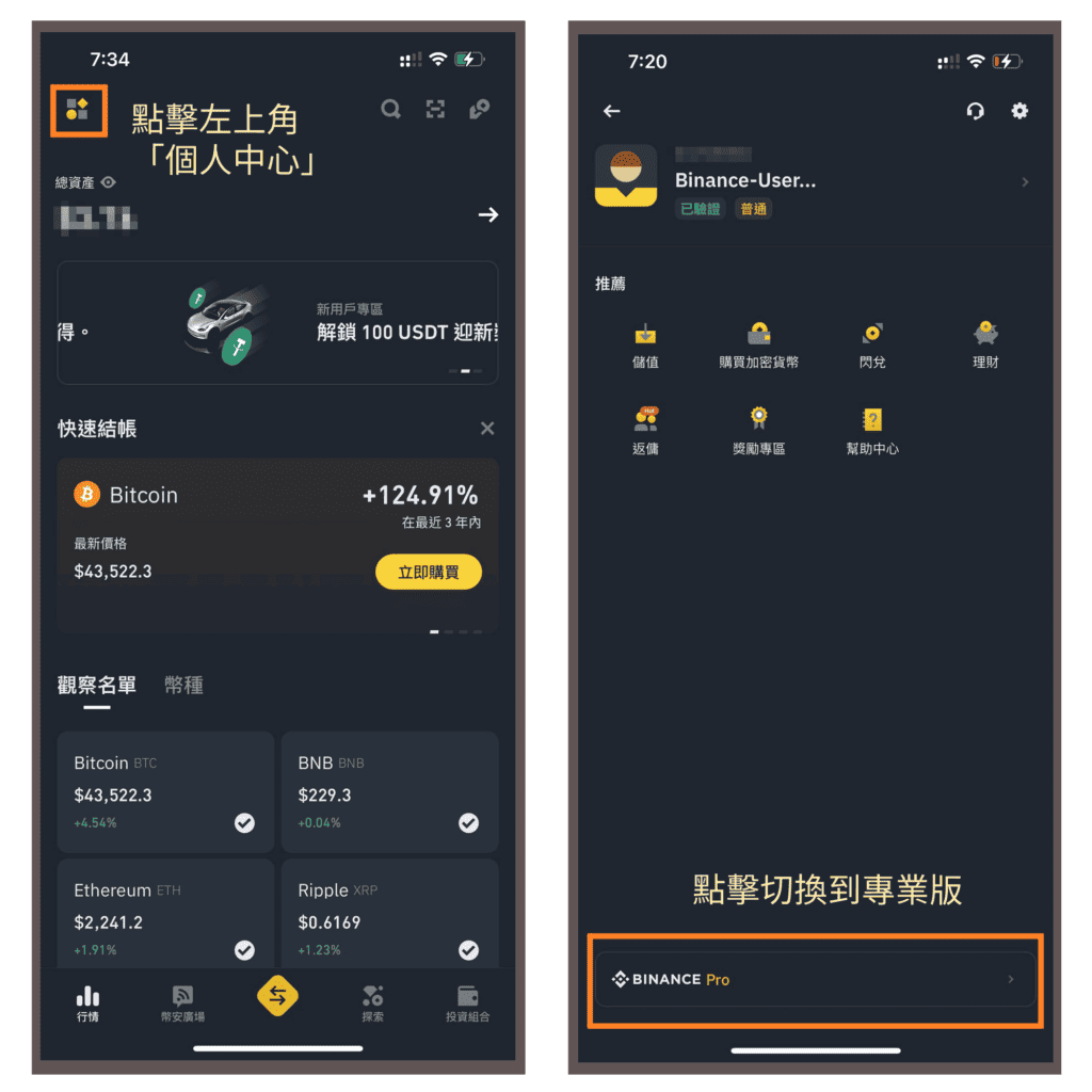「幣安」下載安裝預設的是簡易版,我們可以在幣安首頁,點擊左上角的「個人中心」,下方會出現「BINANCE Pro」,點選後就可以將App切換到專業版唷!