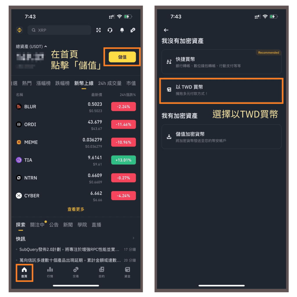 方法一:從首頁進入,點擊「儲值」,再選擇「以TWD買幣」。
