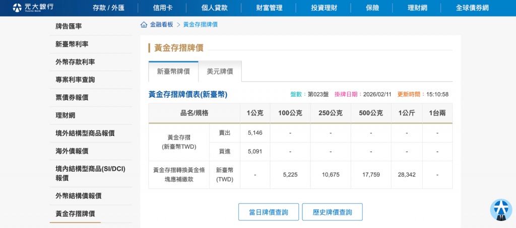 以 2026 年 2 月 10 日元大銀行黃金存摺牌價為例(新台幣計價,每 1 公克):