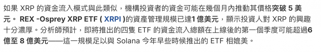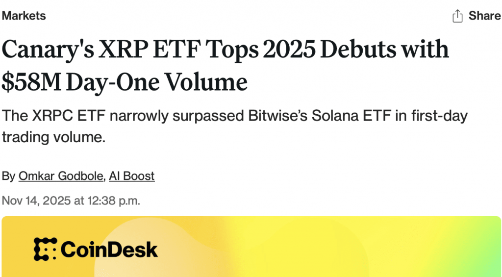 實際表現方面,根據 Coindesk 報導,XRPC 首日表現亮眼,成交金額超過 5800 萬美元,是近期非比特幣類 ETF 表現最突出者之一。