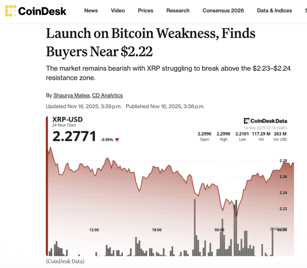 但儘管熱度極高,但 XRP 的價格反應卻相對平淡。ETF 上市當天,XRP 反而下跌了。它從開盤附近的 2.31 美元 一度跌到 2.22 美元,日跌幅約 4%。