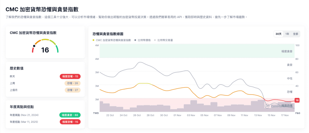 根據 CoinMarketCap 最新的加密貨幣恐懼與貪婪指數,目前指數僅落在 16,屬於典型的「極度恐懼」階段。