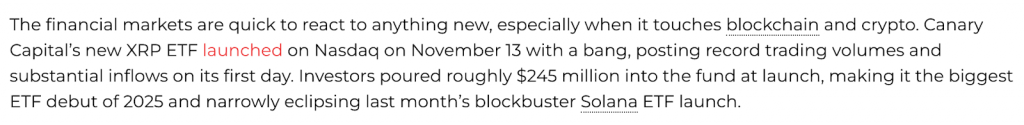 2025 年 11 月 13 日,由 Canary Capital 推出的現貨 XRP ETF (XRPC) 在美國正式上市,這是 XRP 歷史上第一次進入 ETF 市場。