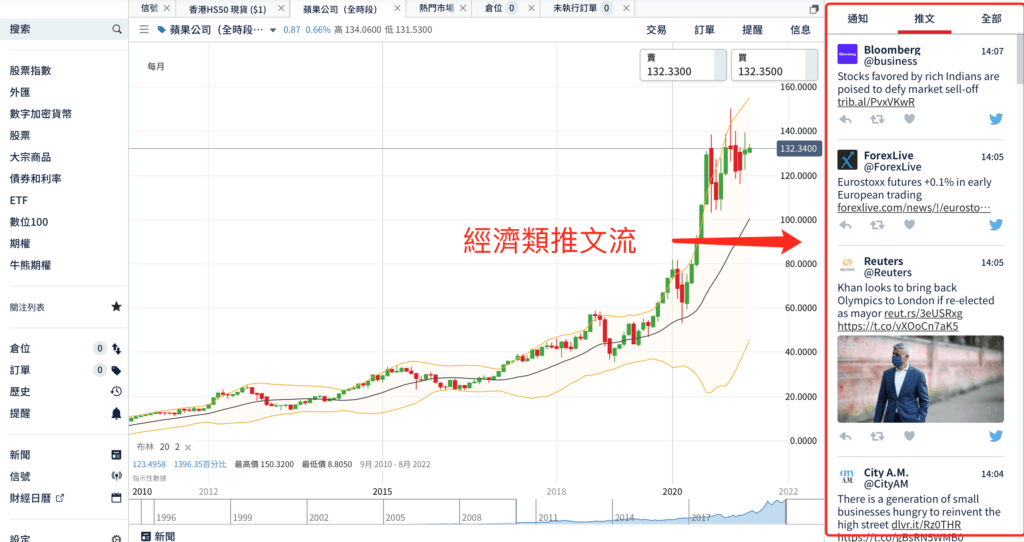 當你進入特定的交易品項時,介面右方也會加載與產品相關的最新新聞,除了湯森路透的新聞外還有相關的推文。