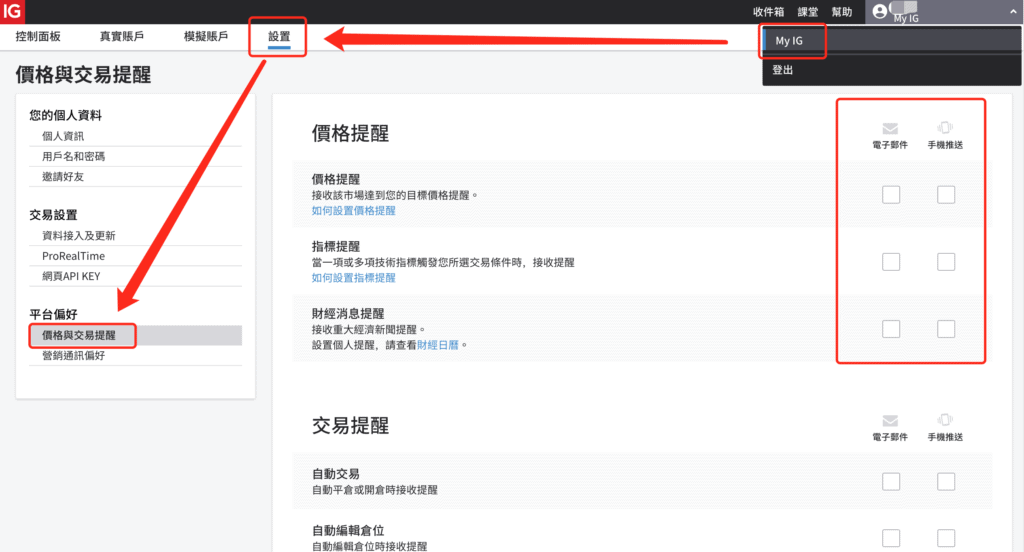 另外,提醒方式需要自己設定,可以選擇「電子郵件提醒」和「手機推送提醒」。具體位置先在介面右上角點擊「My IG」,然後選擇「設置」選項卡,在左邊的「平台偏好」下找到「價格與交易提醒」,就可以設置提醒方式啦!