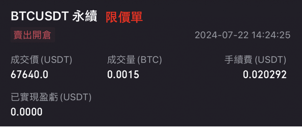 | BTC/USDT | 市價單 | 95.14 | 0.0014 | 67943.4 | 67956 | 0.000001/0.0714% | 12.6 |
