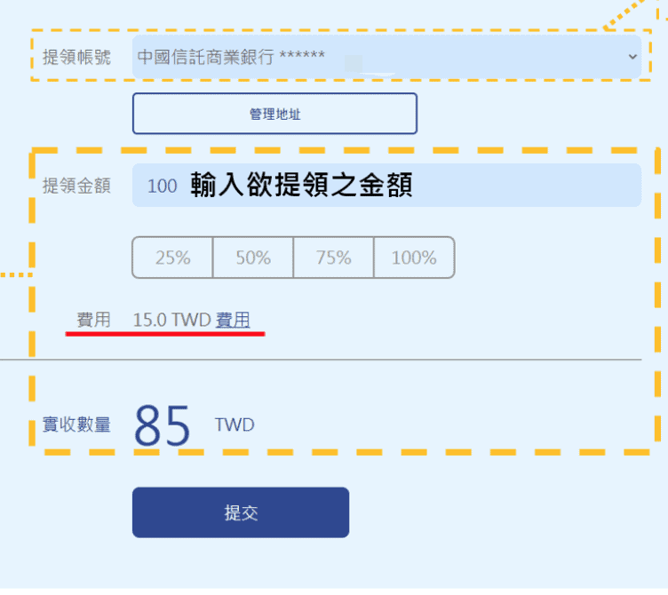 隨後選擇已綁定的「提領帳號」,輸入「提領金額」,系統會計算出扣費後的實收數量,點選「提交」即可。