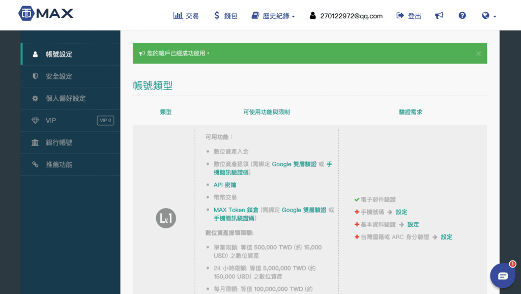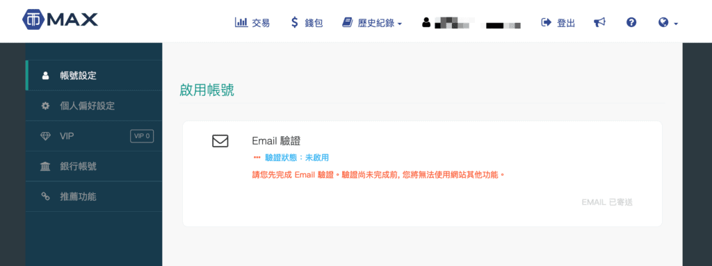 信息沒問題的話會進入帳戶頁面,同時MAX會給你的電子信箱發一個驗證連結;